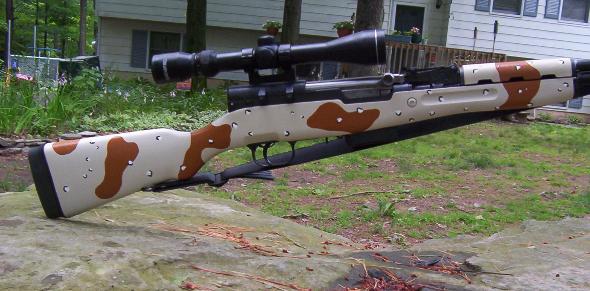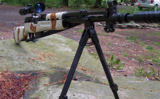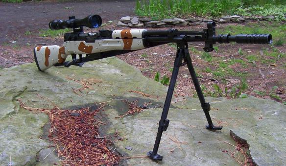The SKS is a semi-automatic rifle used in the armys of many countries including Russia, Vietnam, Albania, China, and many more. Mine is Yugoslavian made. It's one of the better quality examples. Milled trigger guard, milled receiver, just a nice quality piece. It is 7.62 x 39 caliber; it has an integral grenade launcher, that's what that thing is on the front that looks like a silencer. The gun comes with a 10-round fixed magazine and a wooden stock with blade-bayonet. I completely overhauled this rifle recently and took the photos shown below. I custom painted the Desert Storm stock, which started it's life as a plastic red chinese piece. I added an original factory bipod, and a 3-9 power scope on a mount made by Leapers. In the picture it has a detachable 5-round magazine, but i also have a detachable 30-round magazine as well. When sniping with a bipod you shouldn't need any more than 5 rounds anyway. It looks pretty badass now!